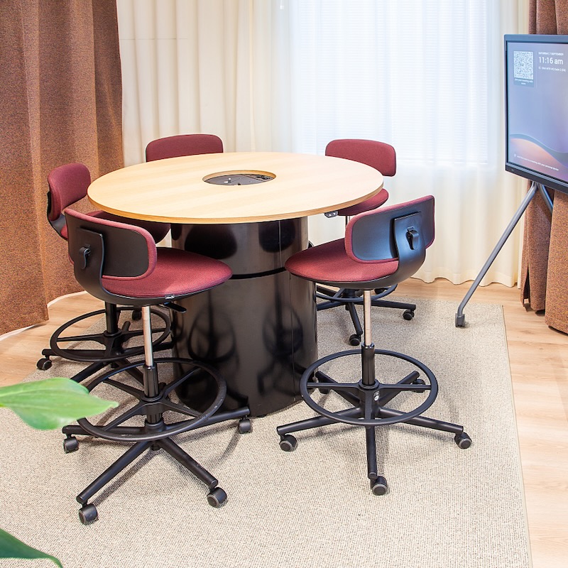 Pöytä sisältää viimeistellyn kannen pöytäluukkuineen ja tyylikkään pyöreän pöydänjalan johon Presson pöytäkaivo ja AV-tekniikka on piilotettu.